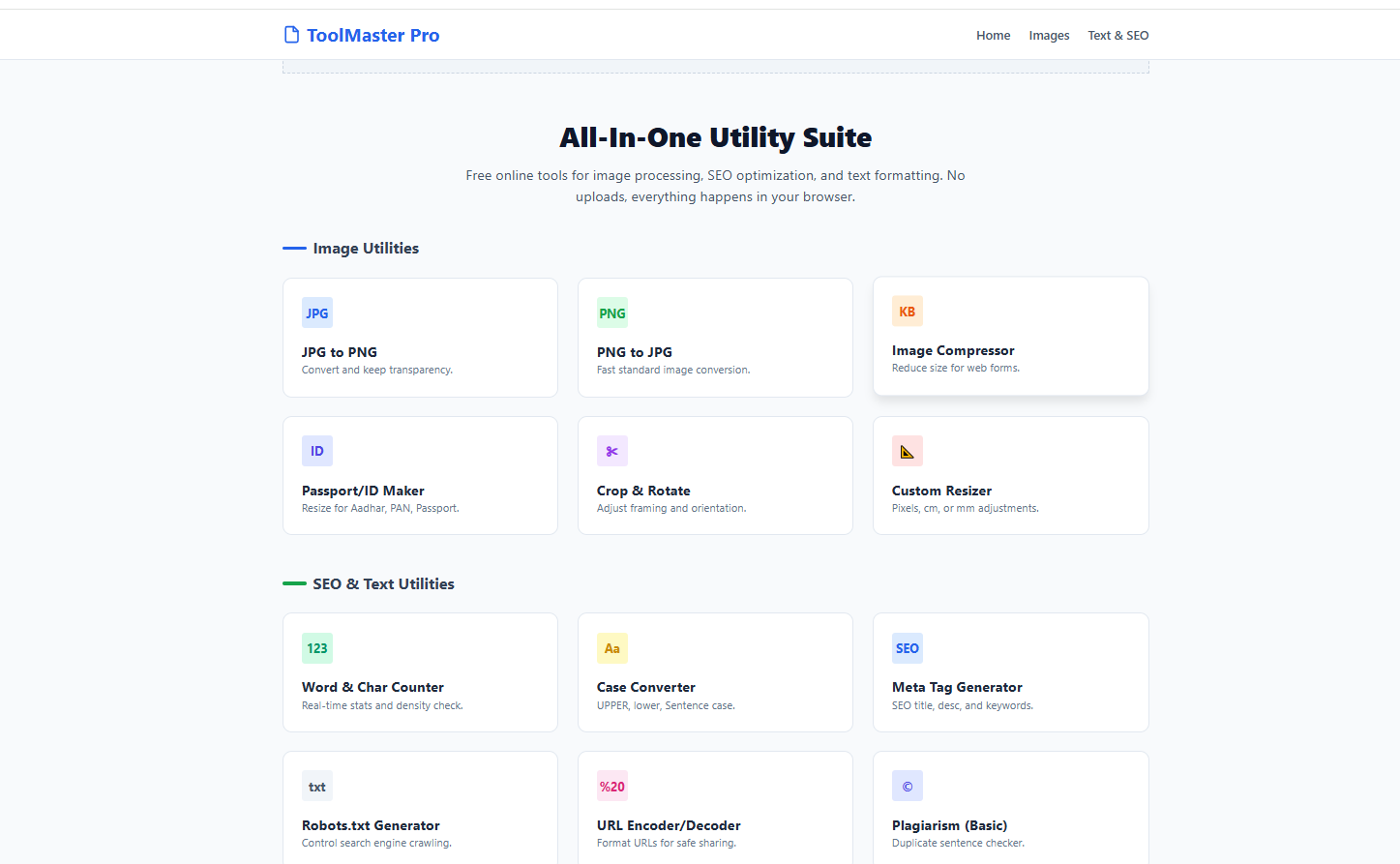 Free online tools for image processing, SEO optimization, and text formatting. No uploads, everything happens in your browser.